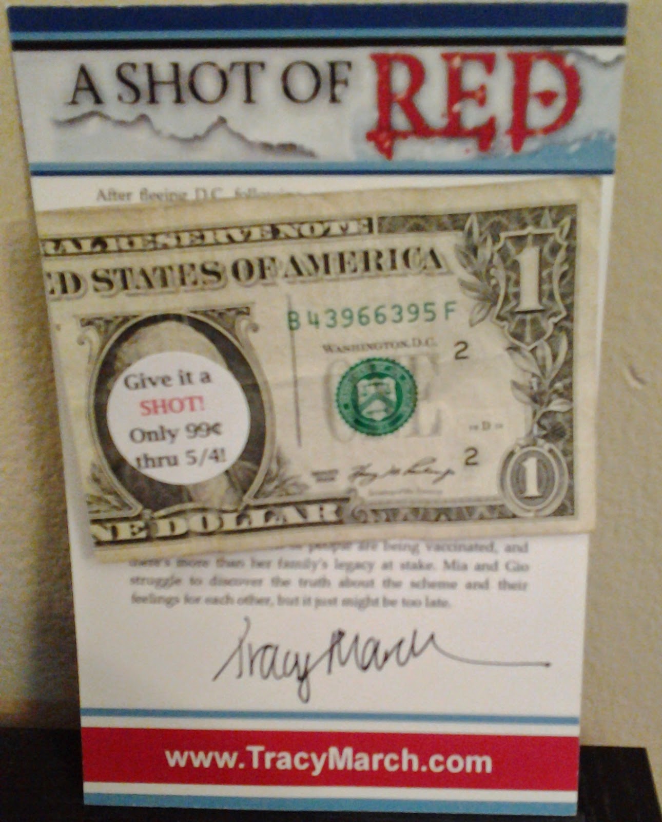 I've only been to two reader events this month and I already have tote bags full of books and swag. Promotional items are a very effective way for authors to get the word out about their latest release and for new authors to introduce them themselves to readers. Among the bookmarks, candy and pens (my personal favorites), there are some clever and very useful pieces. Tracy March handed out cards with a dollar bill attached. Her ebook A Shot of Red is a romantic suspense thriller available at ebook retailers for .99 until May 4th. March writes Romantic Thillers and Contemporary Romance for Entangled Publishing, visit her website www.tracymarch.com for complete title list.