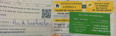 I got a notice one day in our mail box down stairs - it said we were not home (we were) and so .... well not sure ... the rest was in French and goggle translate was having cryptic convulsions trying to translate. There where scribbles on one side so I figured no need to even bother translating that and focus on the other instruction... but that address was way far away outside of Paris...