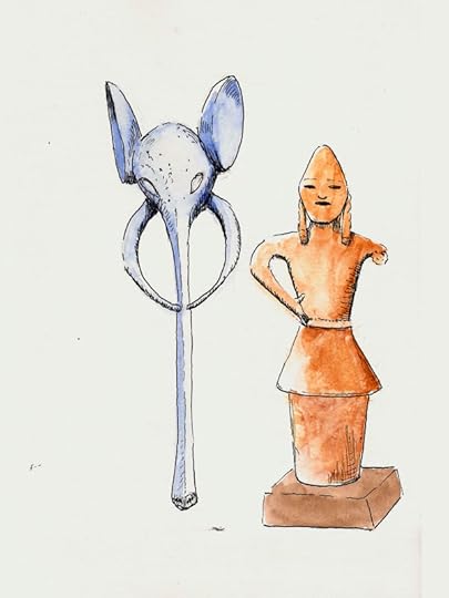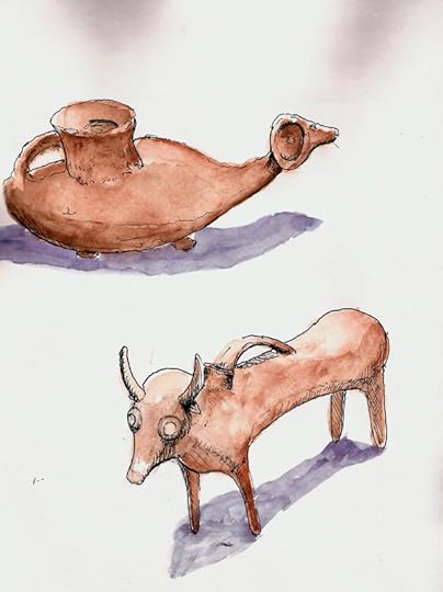 The exhibit is on two floors and I probably should have made a quick run around to inventory things but I just started sketching these small clay figures. They were simple, crude, and I managed to make them even more so when I went out in hall and tried to paint them while standing. I was at least a couple of hands short for that exercise.