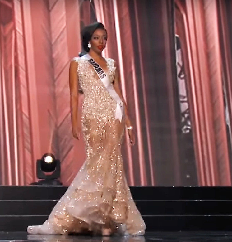 20. Miss Universe Bahamas Cherell Williamson--Cherell wore this golden gown from Bahamian designer Theodore Elyett. This was the first time in 13 years that a Miss Bahamas has worn a gown from a Bahamian designer (Congrats to Elyett!). The gown featured a very heavily beaded applique design with a very full and stiffened horsehair-trimmed hem. It was dramatic, fit beautifully and made Cherell look like a Gown Goddess.