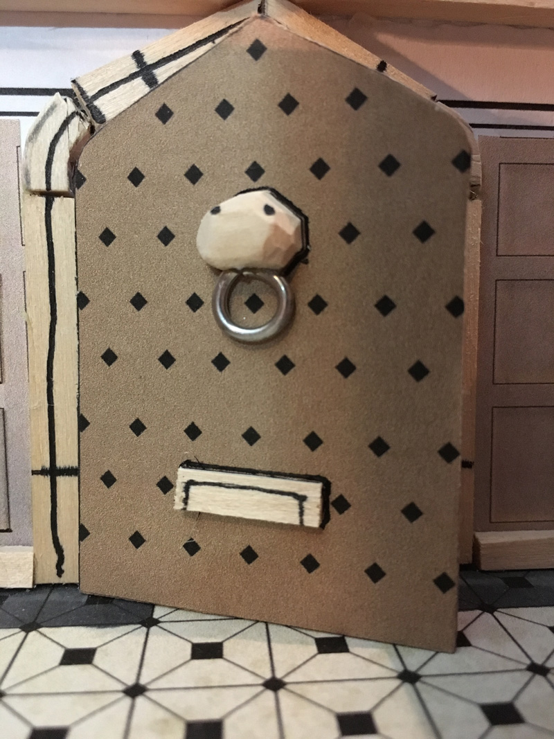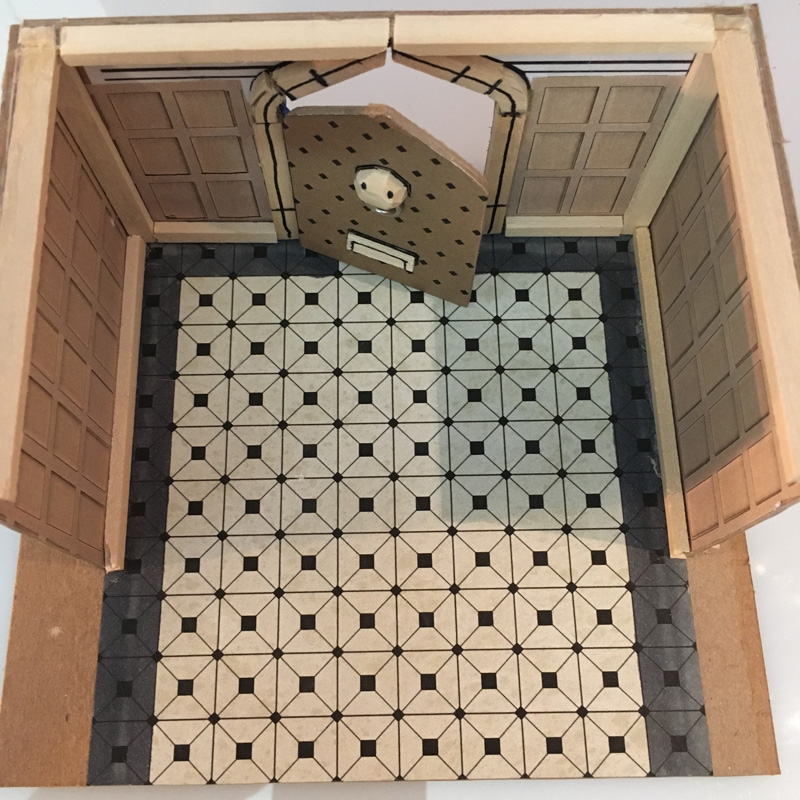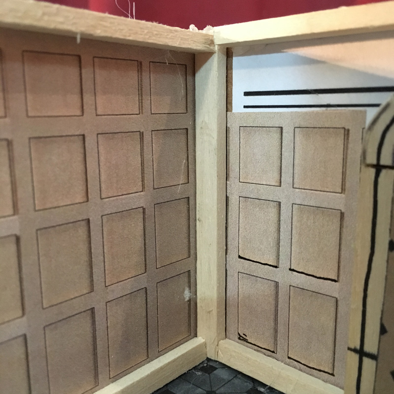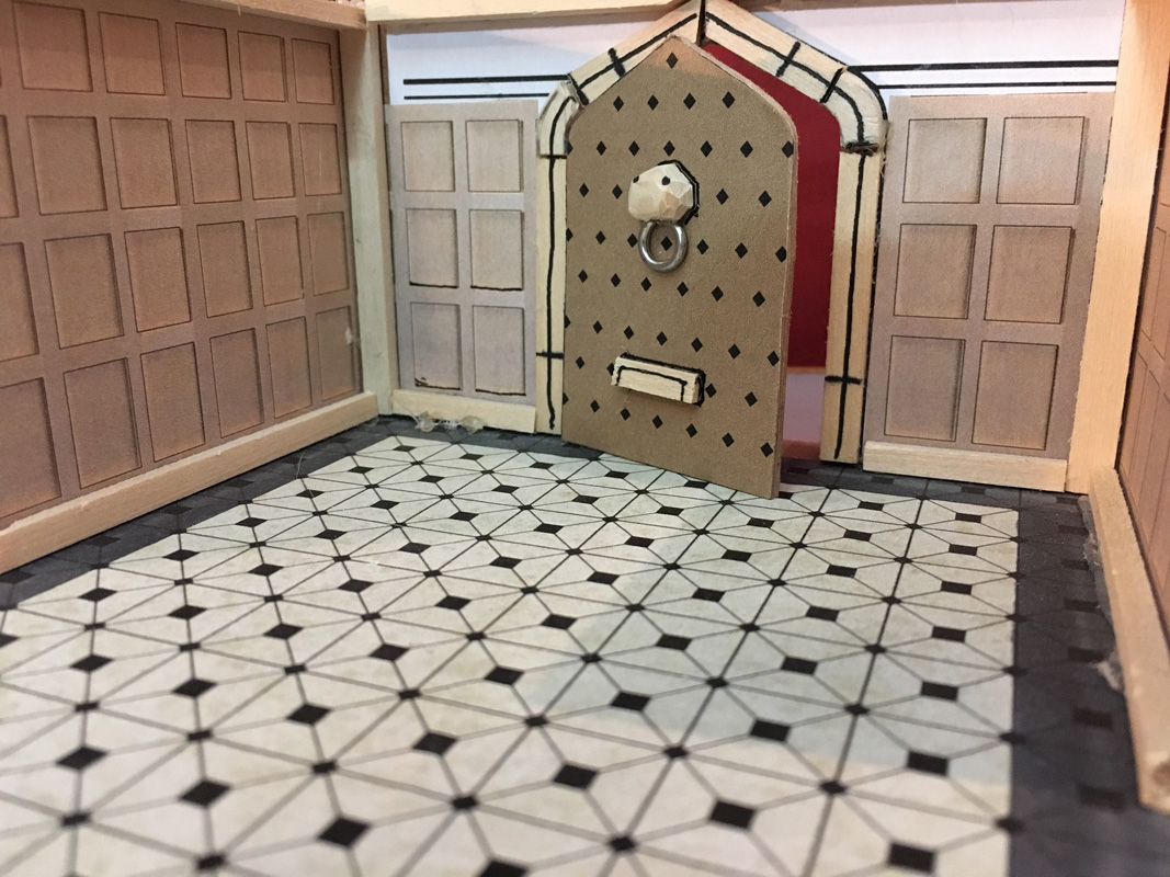 TOAD HALL FOYER:This model is made from chip-board (the stuff the backs of sketchpads are made of) with printed paper details glued on (all the paneling & tile-work) and basswood trim.