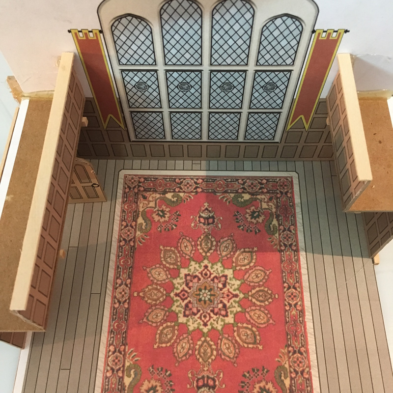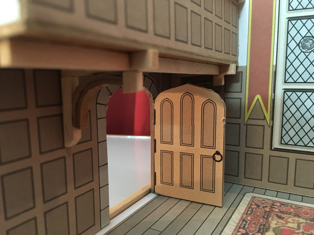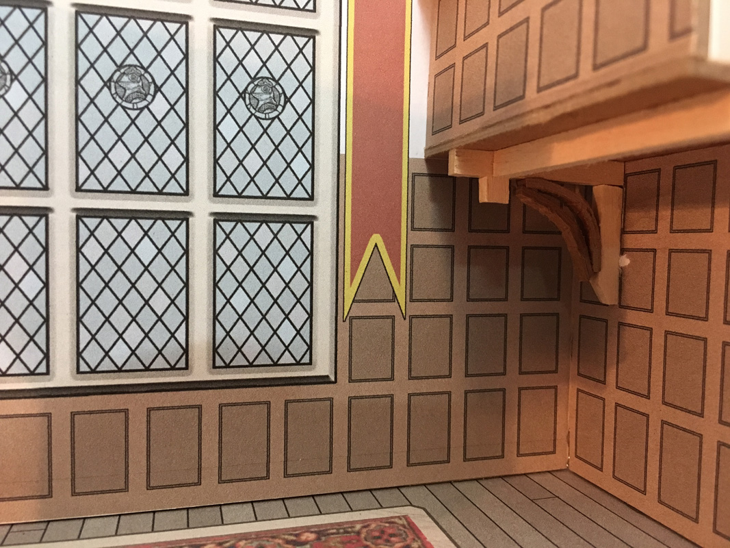 TOAD HALL DINING ROOM:This model is was almost completely made on the computer first. Not the geometry of the room, but each flat surface (paneling, plank floor with rug, arched door, leaded glass window and banners, etc.) were printed designed and then printed out. Those sheets of paper were then rubber cemented on to sheets of chipboard (the thick backing on sketchpads) and glued together using holt melt glue and basswood for re-inforcement (as well as some trim details) where needed.