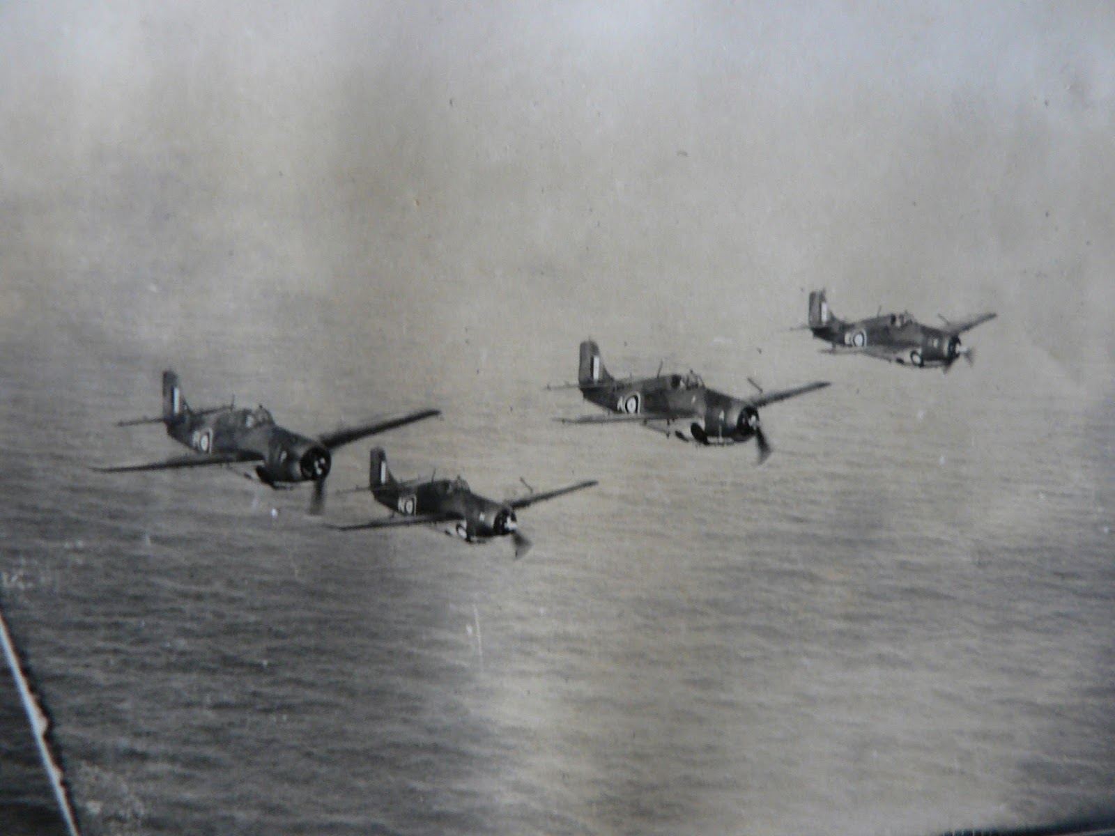 So, with Formidable now out in internet land for sale, I thought I would post some photos of some elements that gave me inspiration for the plot. As I say in the author's notes at the end of the book, my father flew from Formidable in 888 Squadron during the war. The aircraft they flew was the Martlet although the Yanks called it the Wildcat and the RN changed the name back later in the war. It originally went up against the Brewster Buffalo in a procurement competition before the war. It lost, apparently because of cooling issues with its radial engine. The Buffalo went on to be a complete disater when it came up against the Japanese Zero for the first time. The Wildcat would have fared much better. I believe there may have been some skullduggery between the competing manufacturers during the competition - hard to believe of course! However, the French had ordered some which by the time they were ready - they no longer had any need for and the FAA got their sticky fingers on them instead. Not a bad thing at the time as complete neglect of maritime aviation by the RAF in the interwar years meant that the only other fighter available to the FAA was the Blackburn ROC and it only had guns that could fire backwards!! 888 was also unusual as it was commanded by a Royal Marine. So here are a few photos from my father's album: