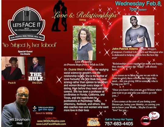 Live at 7:40 p.m. EST TODAY: I’m at the Let’s Face It radio program discussing love, science, and whatever you want to call in about!757-683-4405