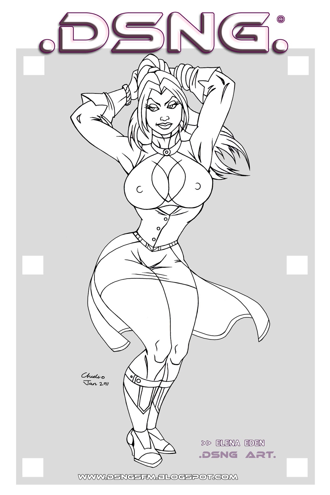 Today I'm quite proud to present this lovely gal... those of you that have followed my work since the late-2000s probably know who Elena Eden is. She is one of the prominent Original Characters from the DSNG Sci Fi Series. And if you google "Elena DSNG", you will see lots of pics of her.Elena was always designed to be voluptuous and sexy, but years later, her design started to slightly resemble the shape of Coco Austin, the wife of rapper IceT - and I've freely used Coco as an art reference for Elena in the past.