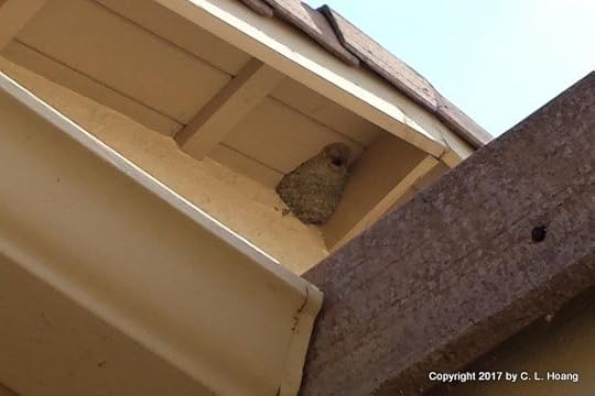 Long story short, the few weeks extended into months as the nest showed no sign of being vacated and bird poop began to pile up on the window ledge under the eave. Then one day while I happened to be out front, I was shocked to find the facade covered with swallows darting and diving toward the nest or clinging vertically to the stucco surface around it. Dozens of them---in frantic, fluttery motion and seemingly swelling in number by the minute. I had no idea what strange thing was going on, but luckily the frenzy subsided after a while and the swarm just flew away.