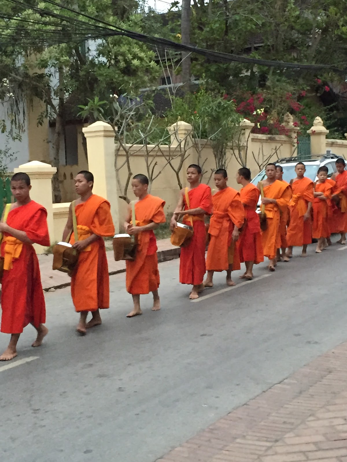 Alms ceremony. Daily ritual ~6 am. Monks and trainee monks will parade in saffron robesto receive rice and other food for sustenance. In return, donors would receive blessings.Many boys from unprivileged background would join the monastery as an outlet from poverty,hunger and lack of opportunities.