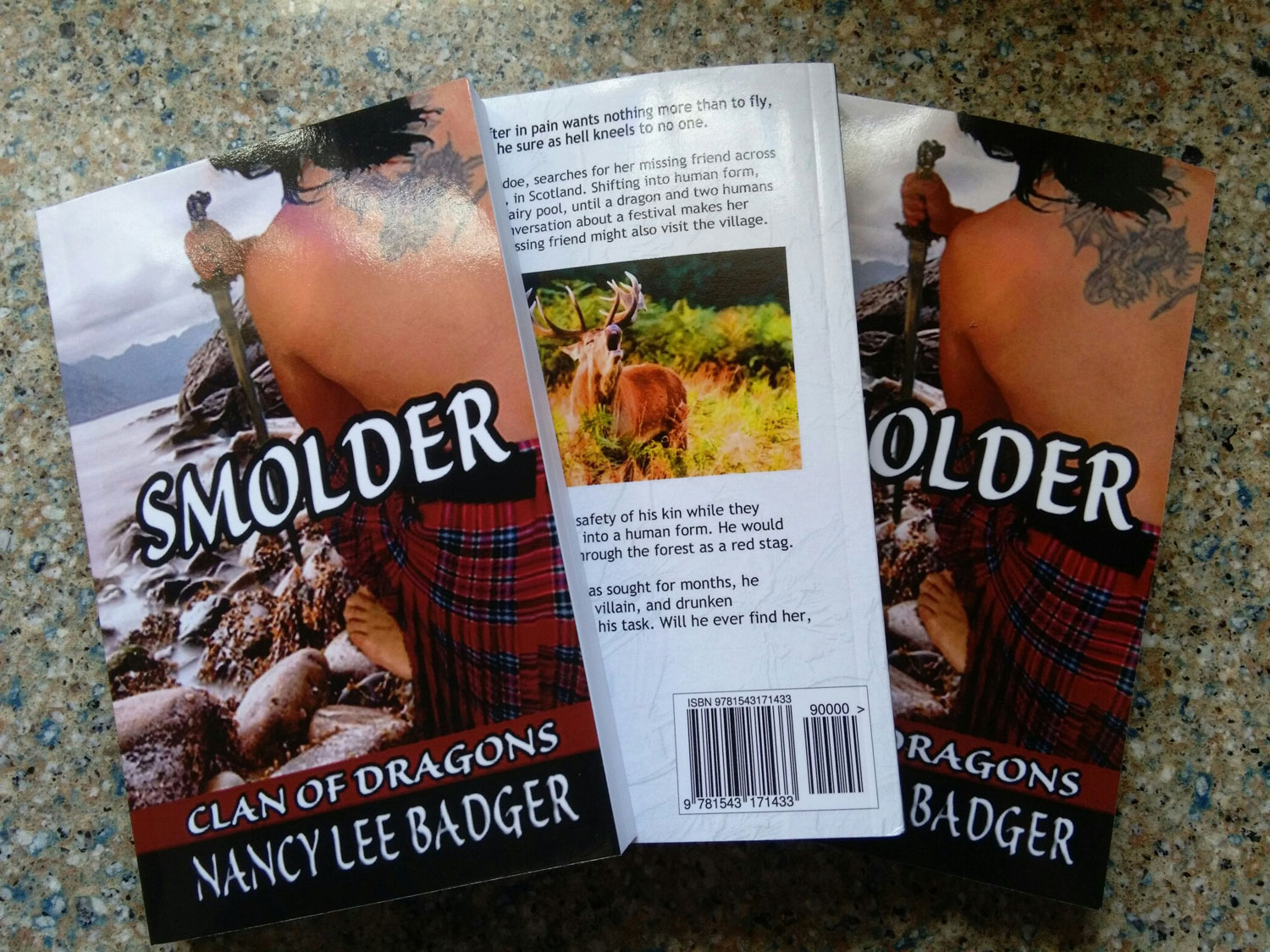 My proof copies recently arrived and hubby and I have been reading through them, catching and correcting a few typos, and hoping that they are ready for release day on March 13th. The ebook of SMOLDER , the third book in my Clan of Dragons series, is available for pre-order at Amazon. A big Thank You to those of you who have pre-ordered it!