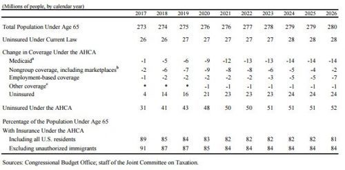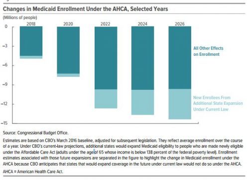 Fourteen million fewer getting insurance in the Medicaid program, 2 million fewer in the marketplaces, seven million fewer in employer-based coverage, and one million fewer from other sources. Under current law, it’s estimated that 28 million people might be uninsured in 2026. Under the AHCA, it would be 52 million people.
