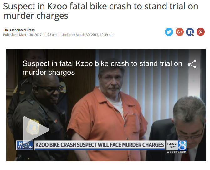 And with the weekend coming we might as well keep it morbid and move on to the driver who killed five cyclists in Kalamazoo, who will now stand trial for second-degree murder: