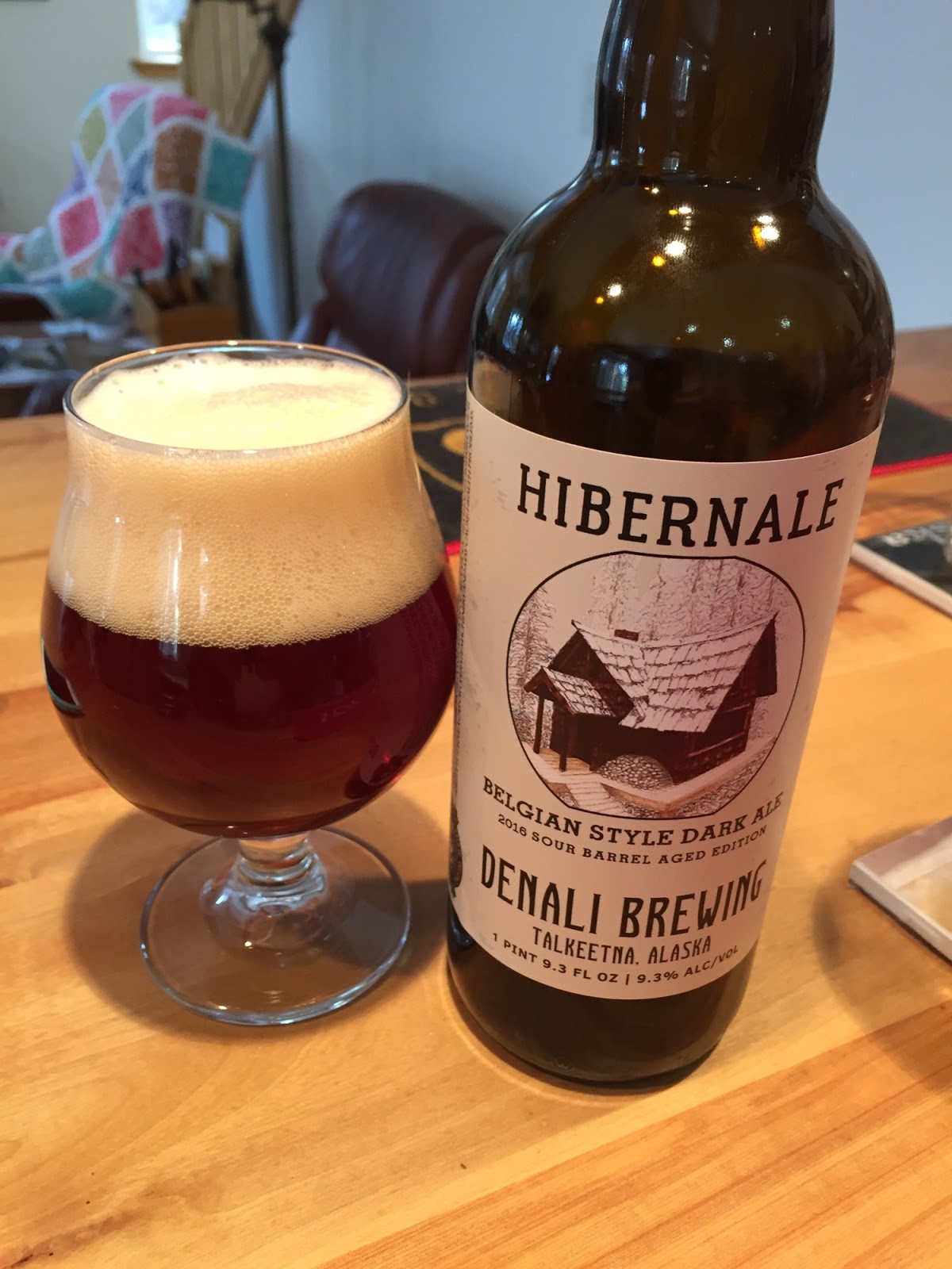 Denali Brewing's Hibernale (2016 Sour Barrel): This beer poured a clear, dark honey color with a nice, cream-colored head. The aroma was plumy, with plenty of Belgian-yeast notes. The carbonation was good, and the mouthfeel was light. On the palate, there were some tart notes, plus the classic dark fruit notes of a Belgian quad. A sour Belgian quad -- a very unusual but excellent combination. 9.3% ABV, 20 IBUs.