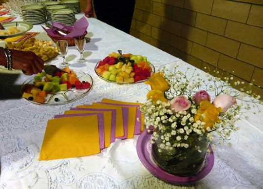 At Beth Israel, there was a beautiful reception ahead of my speech, which included as a lovely touch of bunches of pink and yellow roses - Maddie’s wedding flowers from early in the book.
