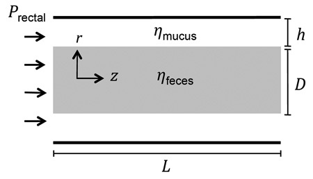 We present a mathematical model for defecation. Our system consists of a pipe whose length consists of the rectum and the colon, illustrated [here]. We model cylindrical feces of diameter D and total length L, consisting of several pieces joined like sausages. The walls of the cylinder are coated with a mucus layer of thickness h, which is considerably less than D. We parameterize the motion of feces and mucus using cylindrical coordinates… in which z represents the horizontal direction along the cylinder and r the radial direction from the center of the feces to the walls.