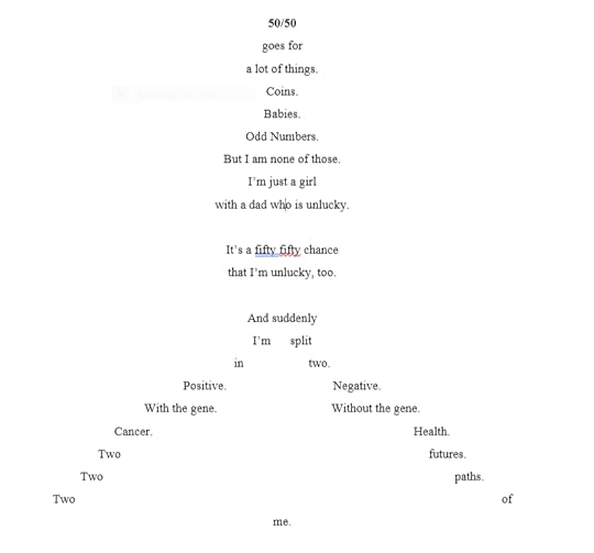 The verse novel is an MG/YA crossover about a girl who finds out she has a 50/50 chance of having the same cancer gene that is killing her father.