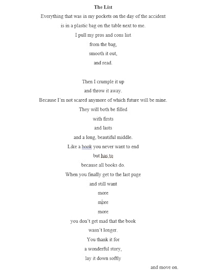 My story spins on this idea of the character wondering, “Am I living or dying?” while simultaneously watching her father die. So, this idea of death and what it means to die is echoed a lot through my book, especially through the last half. Although, I very rarely talk about it outright. I use a lot of symbolism. One poem says death is like finishing a really good book. Another compares terminal illness and death to waiting in an airport and then getting on a plane. The very last poem is left up to the reader as to whether it is another metaphor for dying, or simply something that truly happened, and it’s about crossing a bridge.