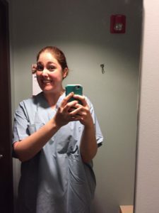 Me in my giant scrubs, mere moments before yet another health professional jammed a needle into my poor knee.