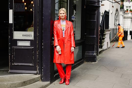 The eagle-eyed among you will spot that I am toting a cup of coffee, the ever-popular street-style prop. I wanted you to see the smudge of red lipstick on the rim, thus bringing the ‘red count’ to six. It felt meta, or in some way a commitment to the cause. The coffee was nice, though; I bought it from the place you see in the photo because I wanted to keep my steps really, really low that day. (It’s not a competition or anything, but my Health app states that 24,000 steps is my record high and 232 my record low. WBU? Please tell me in the comments section. I’m curious and not ashamed about this.)