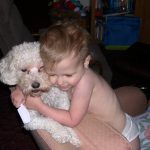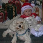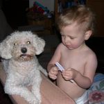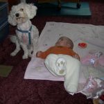 Little Maxwell, an eight pound Bichon (they’re NOT POODLES) began mirroring some of the 80 pound Rottweiler’s behavior. He was 80 pounds of tough guy in an 8 pound, furry package and at the beginning it was hilarious. Amazingly, though, when it came to the new baby he was as gentle as a feather, and he put up with a lot.