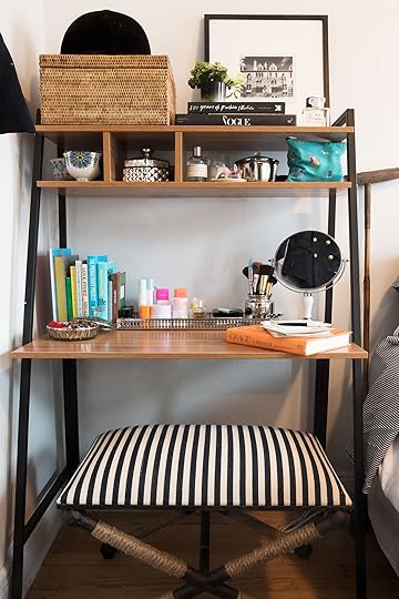 Not everything can be hidden. She left out perfume bottles, books and beauty products that I’d want out in the open should I ever find my room raided by Into the Gloss. But it’s not all for show. “Keep out the things that you use the most frequently. For a more polished look, compartmentalize the items by combining like with like.” (See what she did with the tray on my desk? This has been a wonder of tidiness. It’s this one by House of Hampton.)