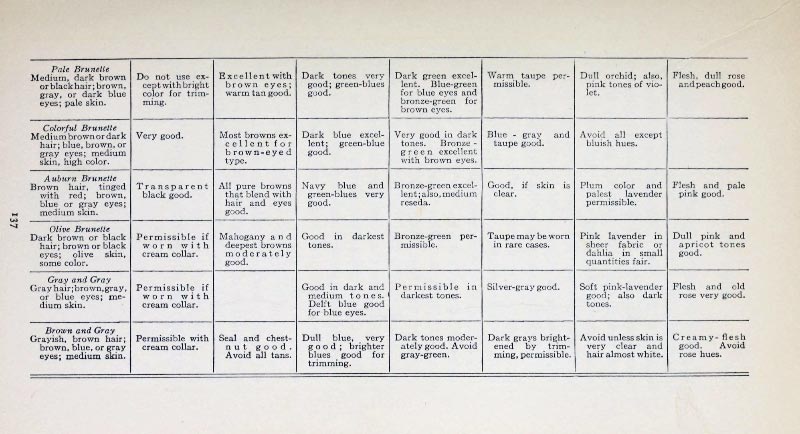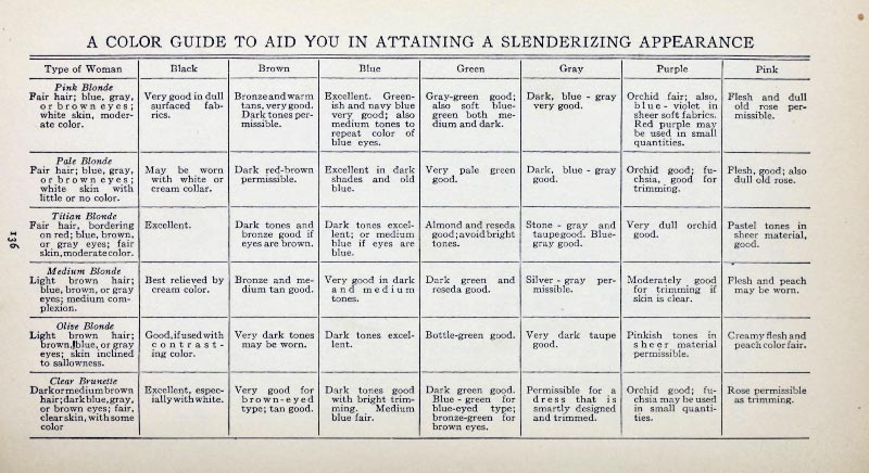 I’ve clipped for your perusal the pages on colors, but the entire book is quite interesting. As well as offering insight into the mindset of a 1920s lady who liked to look elegant & stylish, it offers useful hints as well as commentary many of us can relate to, nearly 100 years later. Her last tip (on page 185) works, I think, for any era.