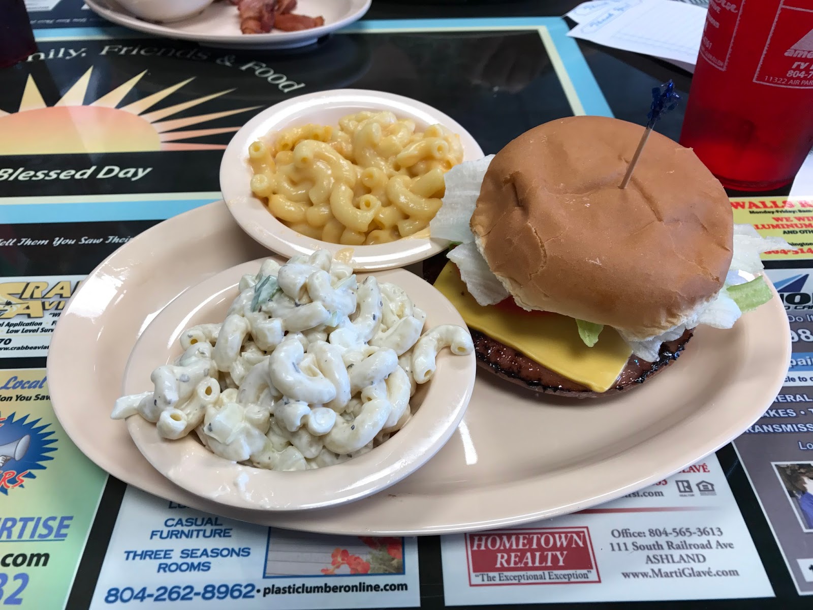 I am a lover of good junk food, so I went for it and ordered the bologna burger with sides of macaroni salad and mac-and-cheese.
