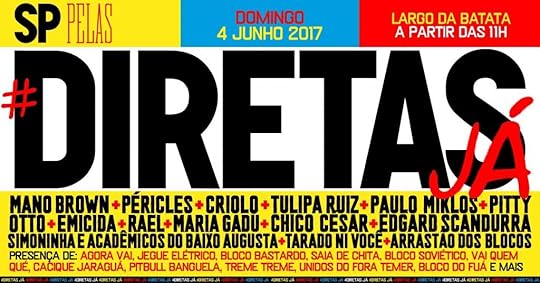 Aqui, o SP Pelas Diretas Já, organizado por Midia Ninja, Arrastão de Blocos, Baixo Augusta e Tarados Ni Você, conta com Mano Brown, Criolo, Emicida, Otto, Tulipa, Maria Gadu, Simoninha e mais.