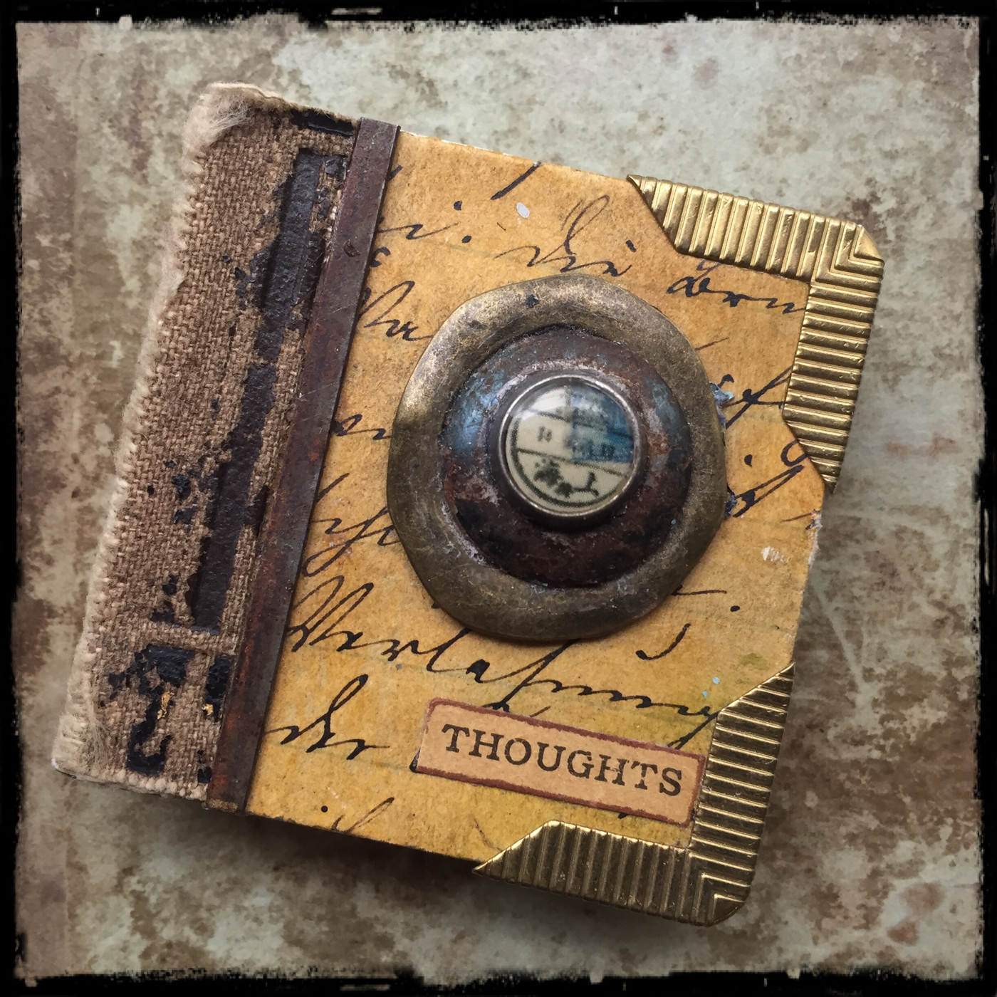 I love working on a small scale. A perfect example of that is the original journal I made for my 52 Card Pickup workshop. Made from a standard deck of playing cards measuring 3.5 x 2.5 inches, this little project is filled with a whole lot. I recently came across a book I made for my retreat last year in Taos, New Mexico. At 2 x 2 inches, this book makes the deck of cards seem large. I do not find working on such a small surface limiting at all. Instead, I feel like a whole universe can be created on each tiny space. How about you? Do you like working small? Large? Both?