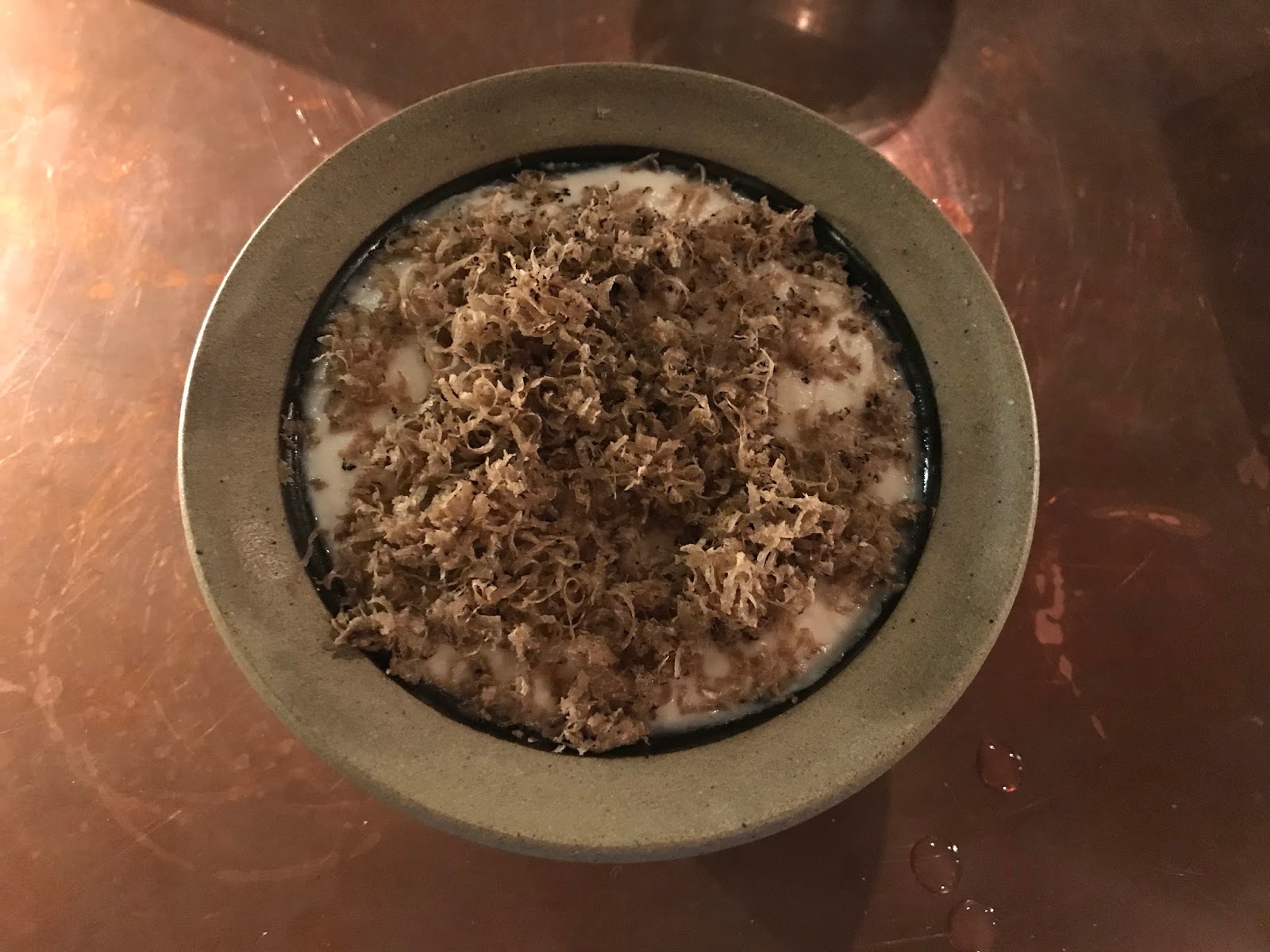 A soup of pureed black beans also proved to have pork fat and tomato relish in it, though it was a perfectly smooth puree whose ingredients appeared only in their taste. Atop the soup sat a celeriac foam and, in a touch that paired the lowly black bean with an equally earthy high-end ingredient, summer truffles.