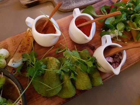 Meie Piretiga võtsime eelroaks kahepeale suure vaagna, millel on kõik nende eelroad esindatud. Lisana oli meile sinna pandud kurgi-petisupp, mis muidu kombos ei ole, aga jumal tänatud, et oli. Tõesõnaga on kurgi-petisupp viimane asi, mis mind kuskil menüüs paeluks, aga see oli mu peaaegu lemmik. Päris lemmikud olid rohelised pannkoogid kahe kalamarjaga, sest ma armastan kalamarja! Aga see supp oli peaaegu sama hea. Ma lausa uurisin teenindajalt, kuidas seda tehakse ja selgus, et värsked hapukurgid lastakse mahlapressist läbi! Okei, kindlasti tehakse seal midagi veel, aga ühel kuumal suvepäeval proovin ma seda kindlasti!