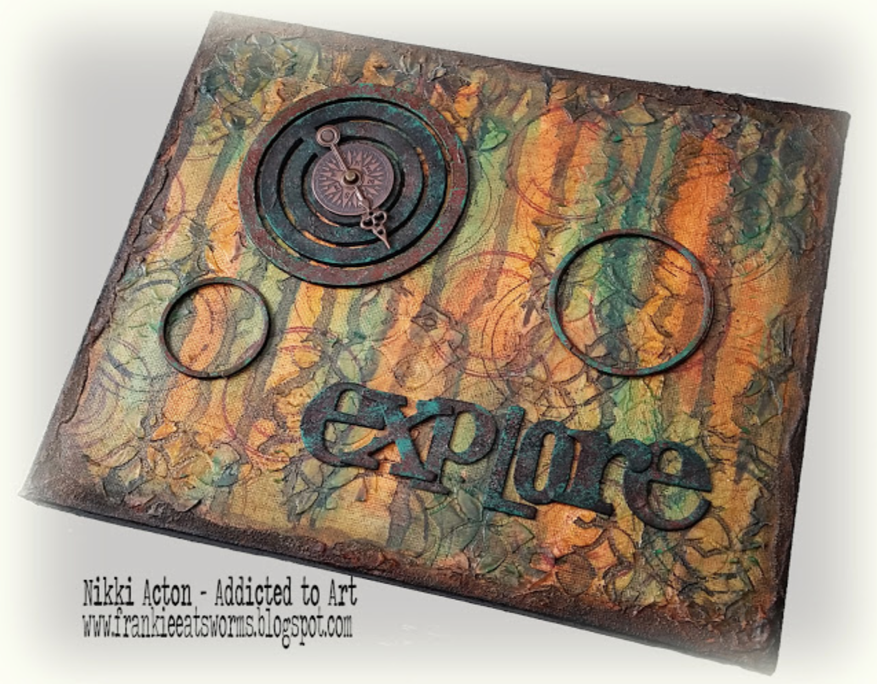 (Spellbinders Splatter Proof Die Set, Drip Drop Die Set, Robo Ring Die Set, Take Flight Die Set, Laser Beams Embossing Folder; Impression Obsession ConText Rubber Stamp Set, Pattern Play Rubber Stamp Set; StencilGirl Past Present Future Stencil, Numbers Stencil, Urban Circle Stencil, Story Time Stencil)Debi Adams