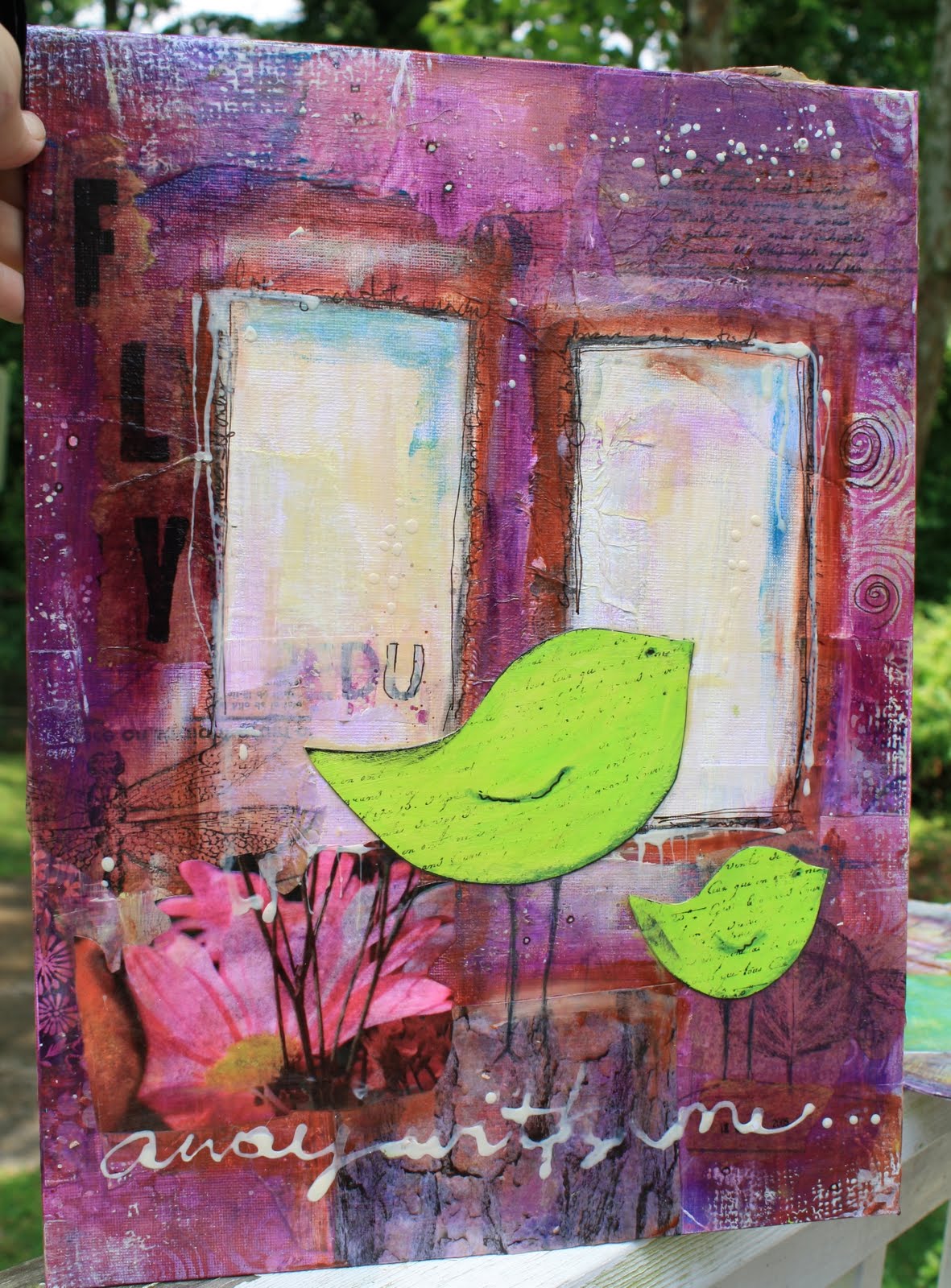 By and large, I think my work is distinctly textured with lots of layers, contemporary in color palette, and almost always inspirational in some way. I oftentimes incorporate hidden messages, inspirational words or free expression journal writing in my pieces. That said, a girl is allowed to change her mind and go in a different direction if she wants to! (fly away with me)