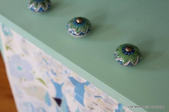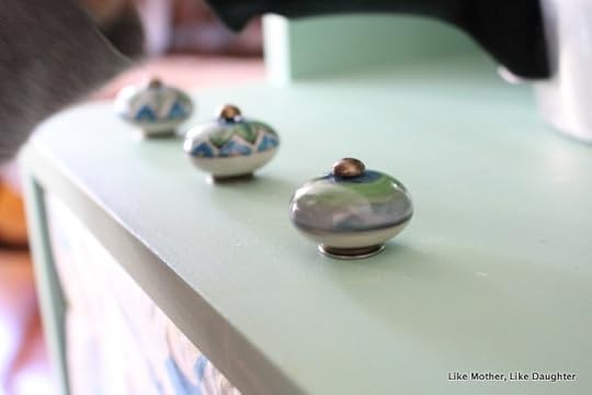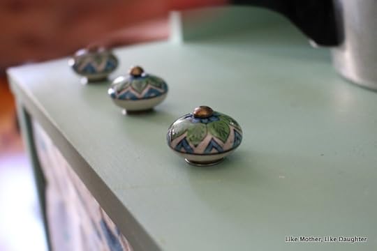Drilled holes and put in these adorable knobs that happened to go perfectly. The knobs are courtesy of my mom, who just had them around (as one does). I put washers in between the knobs and the wood so that they would spin easily, and put another washer underneath with the bolt holding it in place.