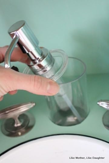 I wanted the kitchen to have a real feel – I was envisioning a play kitchen with most of the elements being metal or glass for a fun tactile experience and toy longevity. Somewhere along the thought process, a soap dispenser came to mind. I went for it on the principle that children love games that involve water. This is getting close to combining the fun of a play kitchen with the fun of a water table. I also quickly learned that buying an actual metal faucet would depart from “thrifty DIY” territory, nor was such a thing likely to fit in this small space.