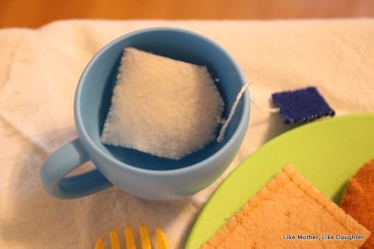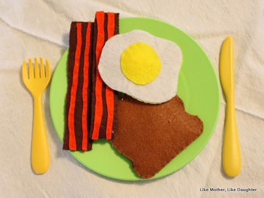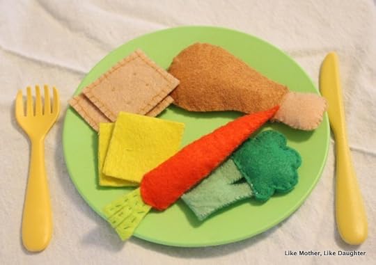 Christmas 2016, I expanded upon the theme and bought this set of dishes from Green Toys. I did a bit of research on felt food and ended up making a selection as stocking stuffers. Felt food, it turns out, can be a masterpiece and looking into it can be a rabbit hole – I made a Pinterest board which you can check out if you want to check out some different sources of inspiration. I wanted something simple and didn’t want to let myself get carried away, so I went ahead and just copied what this lady did (I didn’t print out pdfs, as it was easy enough to eyeball it). I bought this pack of felt from Amazon (it works – although it’s a bit more stiff than one would like ideally) and used cotton balls as stuffing where needed.