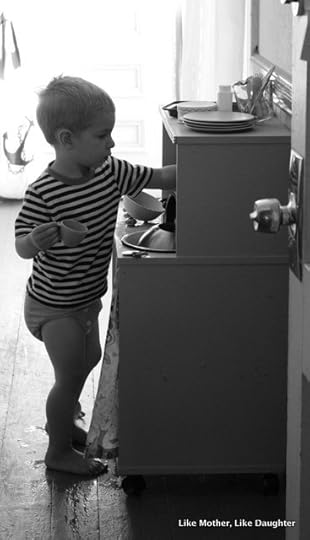 Another upside to the fact that the cart is on wheels: when the play kitchen is in its place in the play room on the carpeted floor, no water is allowed. But on a hot day like the ones we’re having nowadays, I can move the cart out into my kitchen or the back hall or even out onto our porch and the kids can splash away, “washing dishes!”