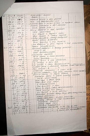 When I got the scrapbooks home, I discovered photos of musicians on stage and chorus girls. There were menus and handbills and all sorts of letters from clients. Harvey Lowe had produced and emceed the opening show, and I found his script. There was even a handwritten listing of every act that played the club from 1964 to 1968!