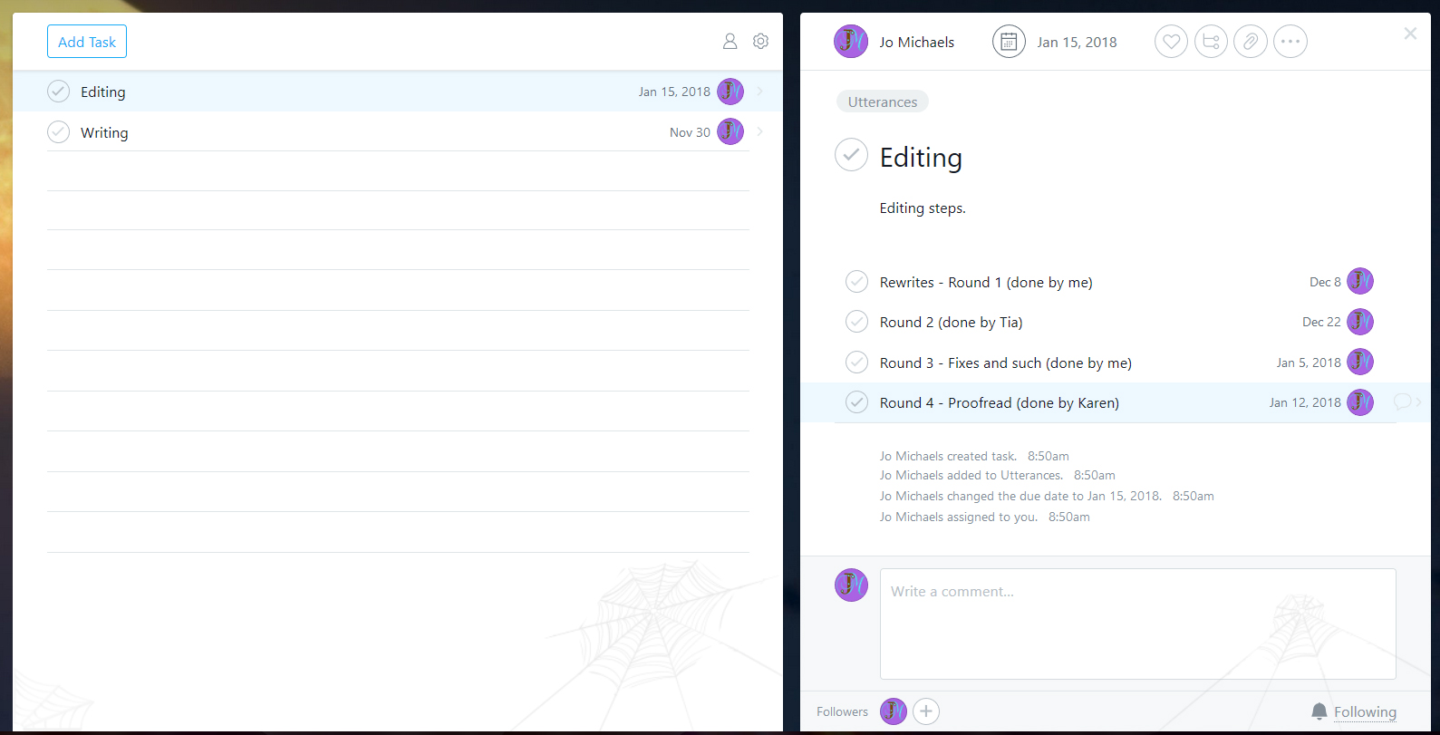 Now, if you're working with other writers or people on a project of any kind, this app reallllly comes in handy. We've used it a ton with the F5 projects we've done. It helped us set due dates for everything from book trailers to marketing to writing and beyond. Each week, it also sends out a project status email that tells everyone in the group what's been done and what's left to do.