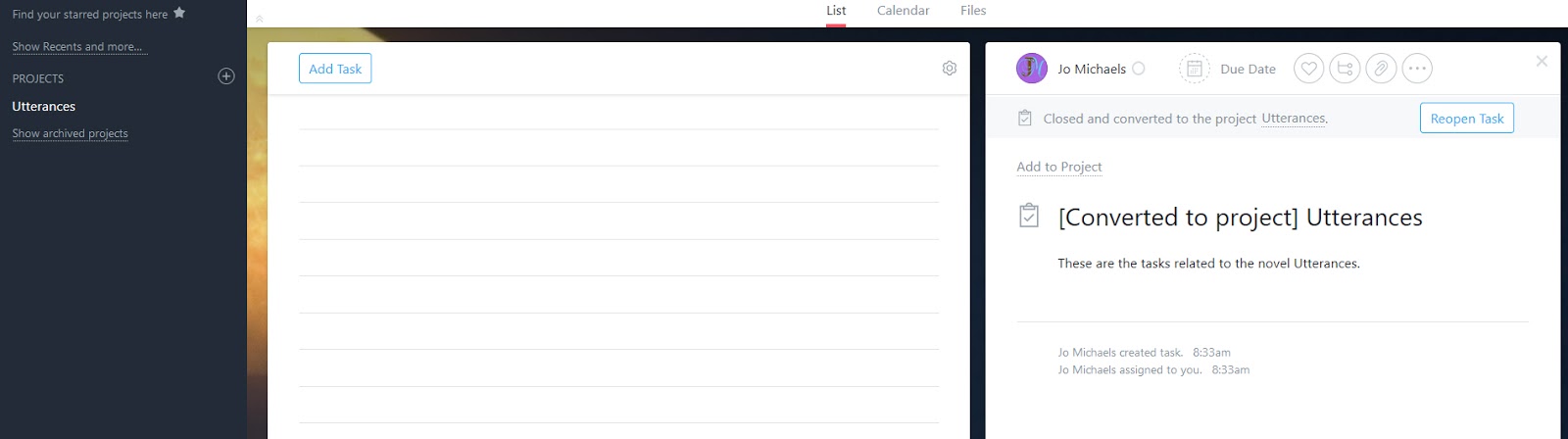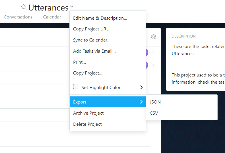 But the best part about the whole thing? IT'S FREE for up to like 10 collaborators. You can add them via email, and their photos pop up on the top left. Plus, you can sync it to your phone's calendar or export the whole thing as a CSV or print to PDF for sharing with someone else, add files to the tasks, and soooo much more. You just click the dropdown next to the project name. See?