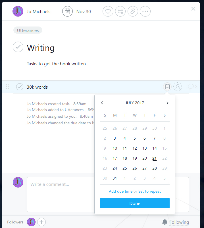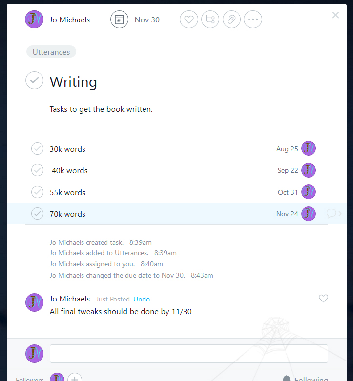 This will allow you to put in your word count goals. Be sure you set due dates and assign the tasks to yourself to get email reminders.