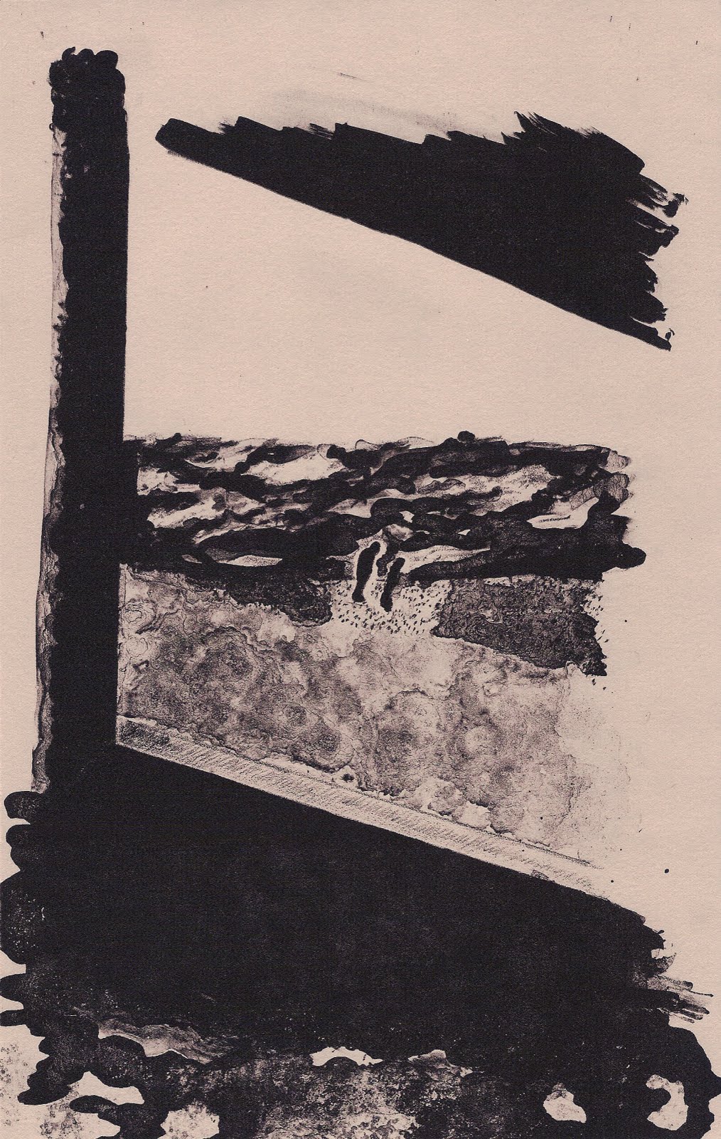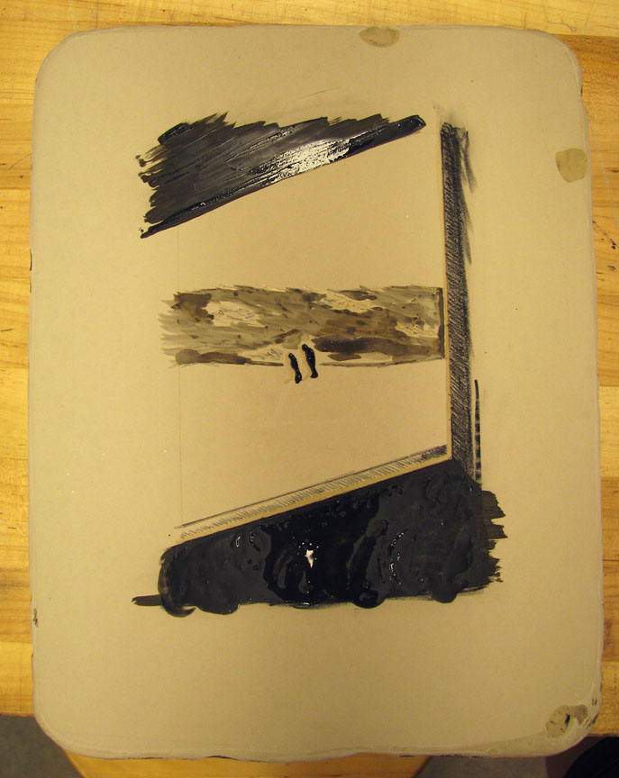 Lithographic stone (pre-etching) at Ox-Bow. Lots of tusche. Playing around with stamping, painting, and dripping with moss. (Yes, actual moss. Little bits of dirt and moss and sand on the surface of the stone there).