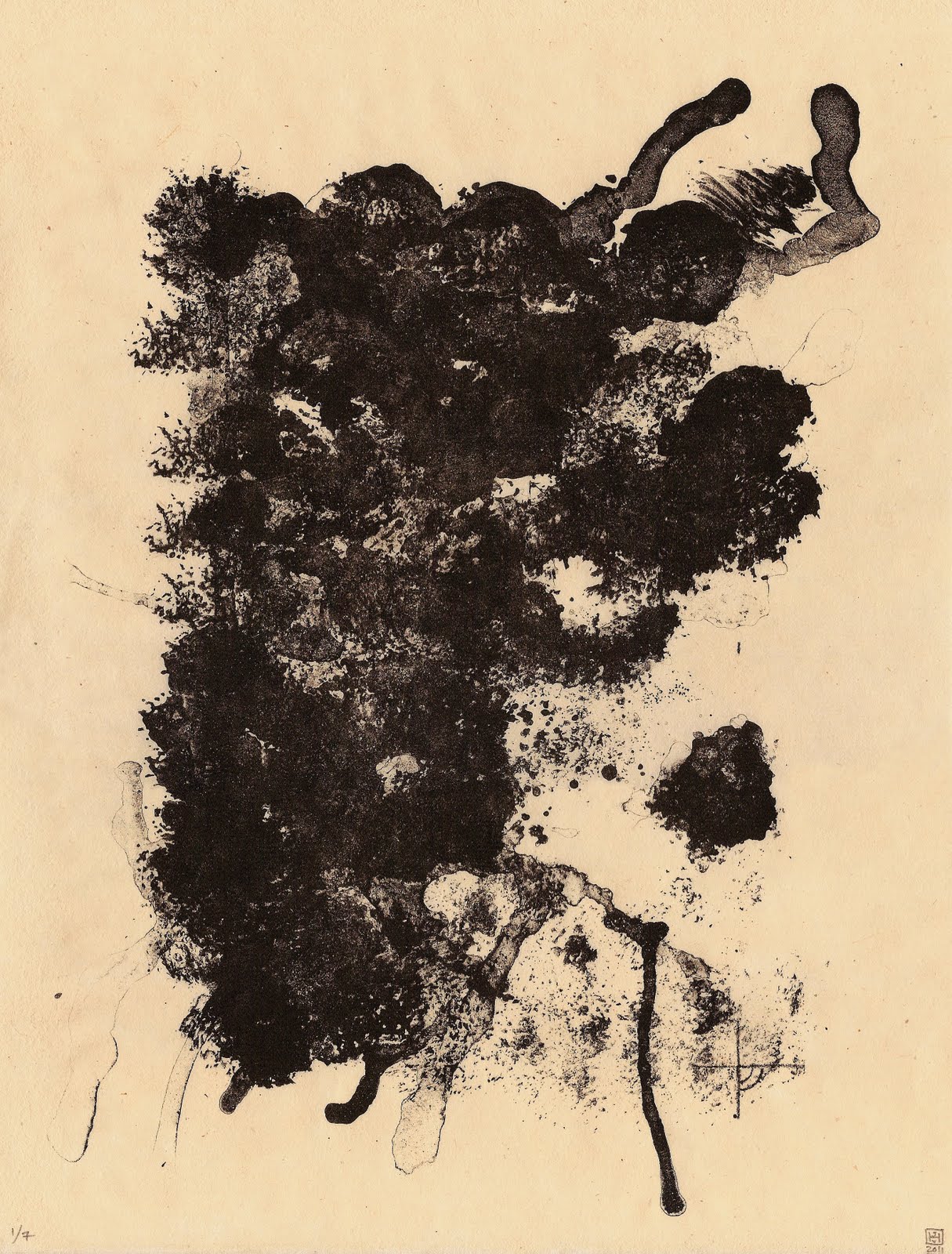 This is the printed state #2 for one of my original cover ideas. A lithograph in black ink on grey Stonehenge paper. Tusche, moss stamping, pencil. Lots of experimentation in the margins.