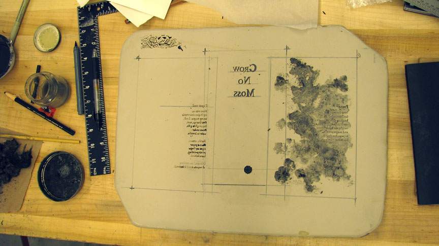 I recently posted on Printeresting about my time in the Ox-Bow print shop, and there are lots more photos from Ox-Bow on Flickr here. I thought I'd share some of the process behind making the lithograph that was printed as the cover of Grow No Moss.