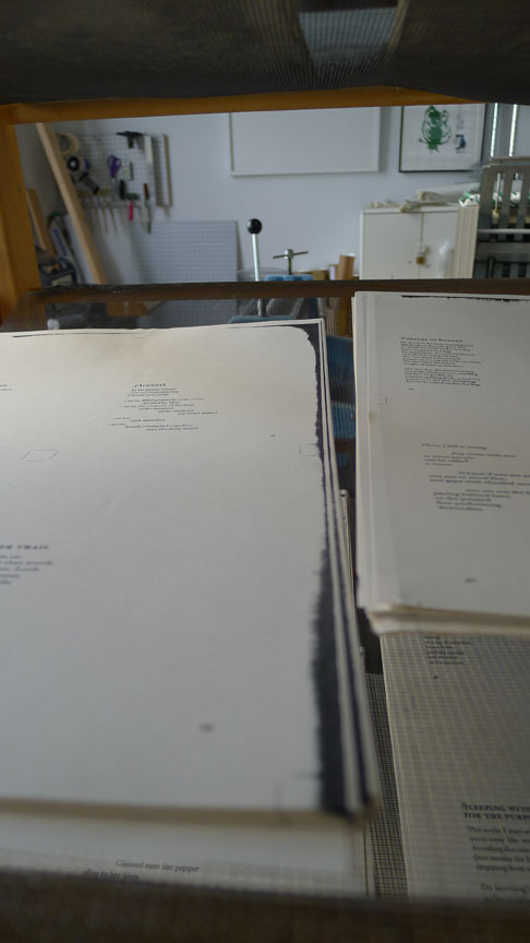 Lithographic stone (pre-etching) with poetry written backwards, playing around with cover options. This stone was big enough that I was able to print multiple sheets of paper for one roll-up and vary the size of the print.