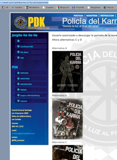 En el sitio de la PDK, www.policiadelkarma.cl estamos discutiendo la portada que debería tener la novela gráfica. Al comienzo incluimos un par de alternativas y a partir de los comentarios incorporamos dos más que cumplieran con los requerimientos. El juego está interesante, uno comienza a ver detalles y a considerar opiniones y puntos de vista en los que no había reparado. Va a ser un experimento muy choro diseñar entre todos algo tan importante, nada más ni nada menos que la cara de la novela.
