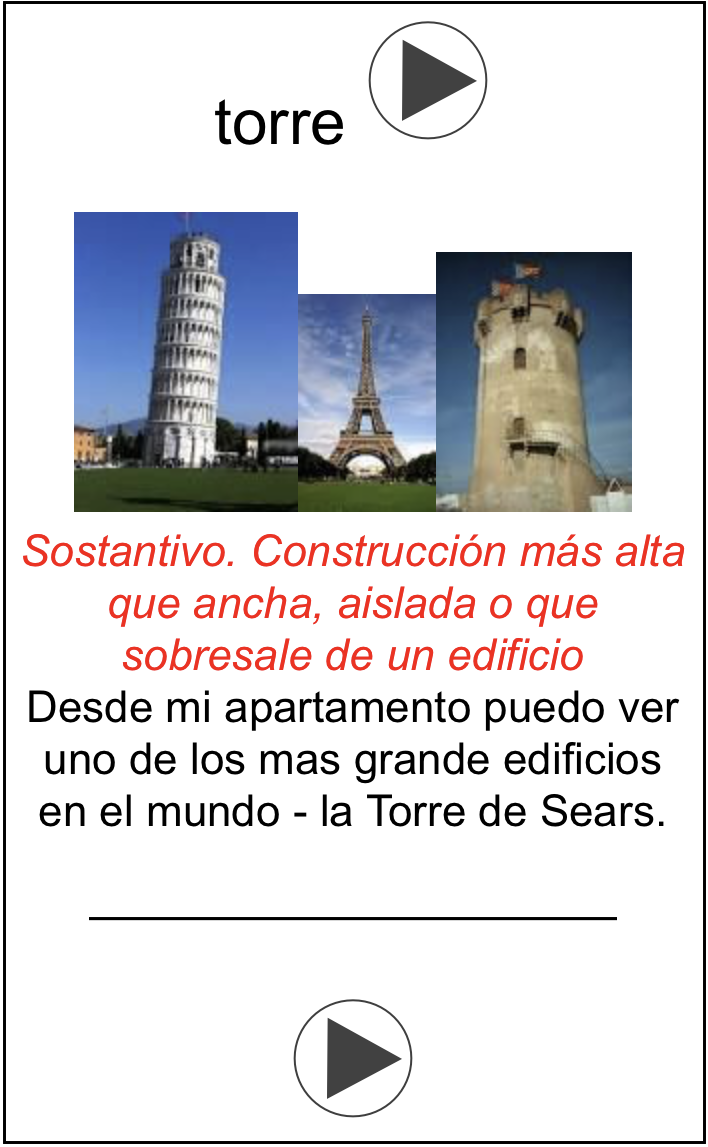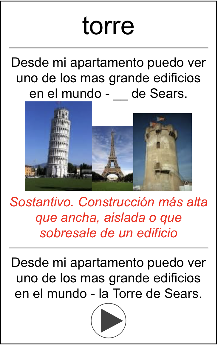 Audio only comprehension flashcards are roughly the same as normal comprehension cards in Fluent Forever. When I hear this card, my goal is to think of any possible use for the word “torre.” When I hear the example sentence on the backside, it reminds me about what that word can mean, and that gives me enough information to decide whether I was thinking about the right word.