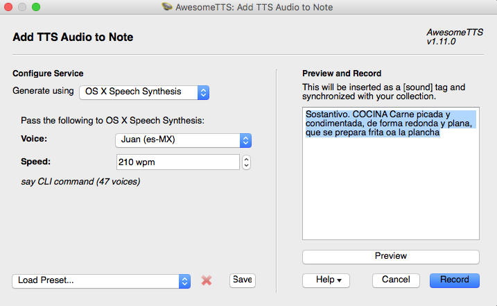 Now, on the left side, play around with different text to speech services. Click the “Preview” button to hear them.Some of them won’t work for a full sentence (they only work with single words/phrases). You may find that Google Translate does it pretty well, though I ended up going for OS X Speech Synthesis (Macs only), since that gave me speed controls and I liked Juan’s voice.
