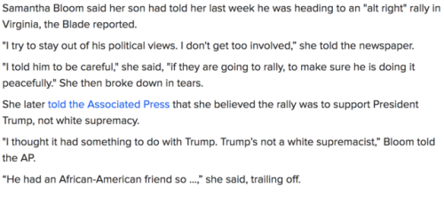 It’s kind of haunting that if his mother hadn’t supported him by watching his cat while he went off to Charlottesville, Heather Heyer might still be alive today.