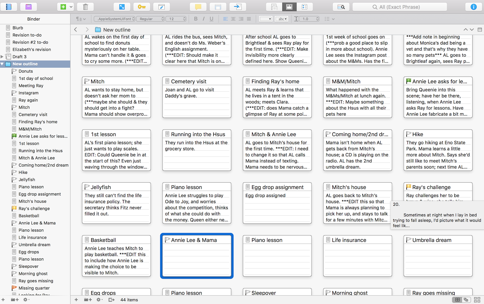 Reverse-outlining my story also helps me figure out in real-time where I should make changes to the novel once I begin really revising. As I outline, I'll usually make little notes to myself, like "Make sure to add stuff about the theme of visibility here" or "Could Queenie be in this scene somewhere?" (Both real notes taken from the revision that I'm beginning for one of my works in progress!)