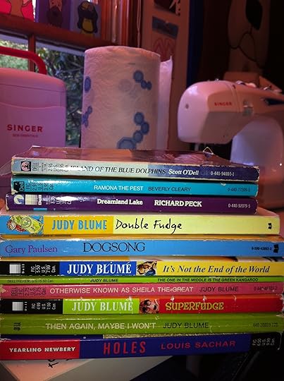 I walked straight to a shelf. Again, I had NEVER stepped foot in this place. Right in front of me was a stack of books. By Gary Paulsen, Richard Peck, Judy Blume. I literally looked up and said OUT LOUD, "Seriously? You have GOT to be KIDDING me." I then proceeded to buy ten books. (For $20!! HELLO!) Plus one for free that the owner gave me because it had a torn back cover and she REALLY said I should read it. She asked why I was buying all these books. And this is where that OTHER voice took over. Surely it was not MY voice that said: