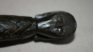 It is not just the marked difference in the workmanship which shows this to be a weaver’s sword, but also other items found in the vicinity, which include a wooden thread-winder carved with two horses’ heads, also associated with fabric weaving.